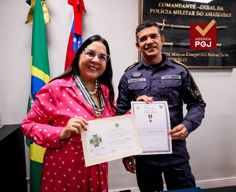 A chefe do MP amazonense recebeu as Medalhas Cândido Mariano e Ordem do Mérito, entregues pelo comandante-geral da PMAM, coronel Klinger Paiva. As honrarias reconhecem personalidades que se destacam pelo compromisso com a Justiça, a legalidade e a prestação de serviços relevantes à sociedade.