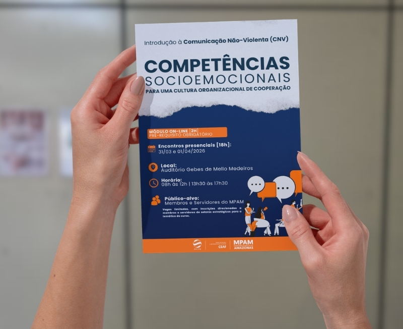 Nos dias 31 de março e 1º de abril, o Ministério Público do Amazonas (MPAM), por meio do Centro de Estudos e Aperfeiçoamento Funcional (Ceaf), promoverá o curso “Competências Socioemocionais para uma Cultura Organizacional de Cooperação: Introdução à Comunicação Não Violenta (CNV)”. A iniciativa busca fortalecer a colaboração, o respeito e o bem-estar no ambiente de trabalho.