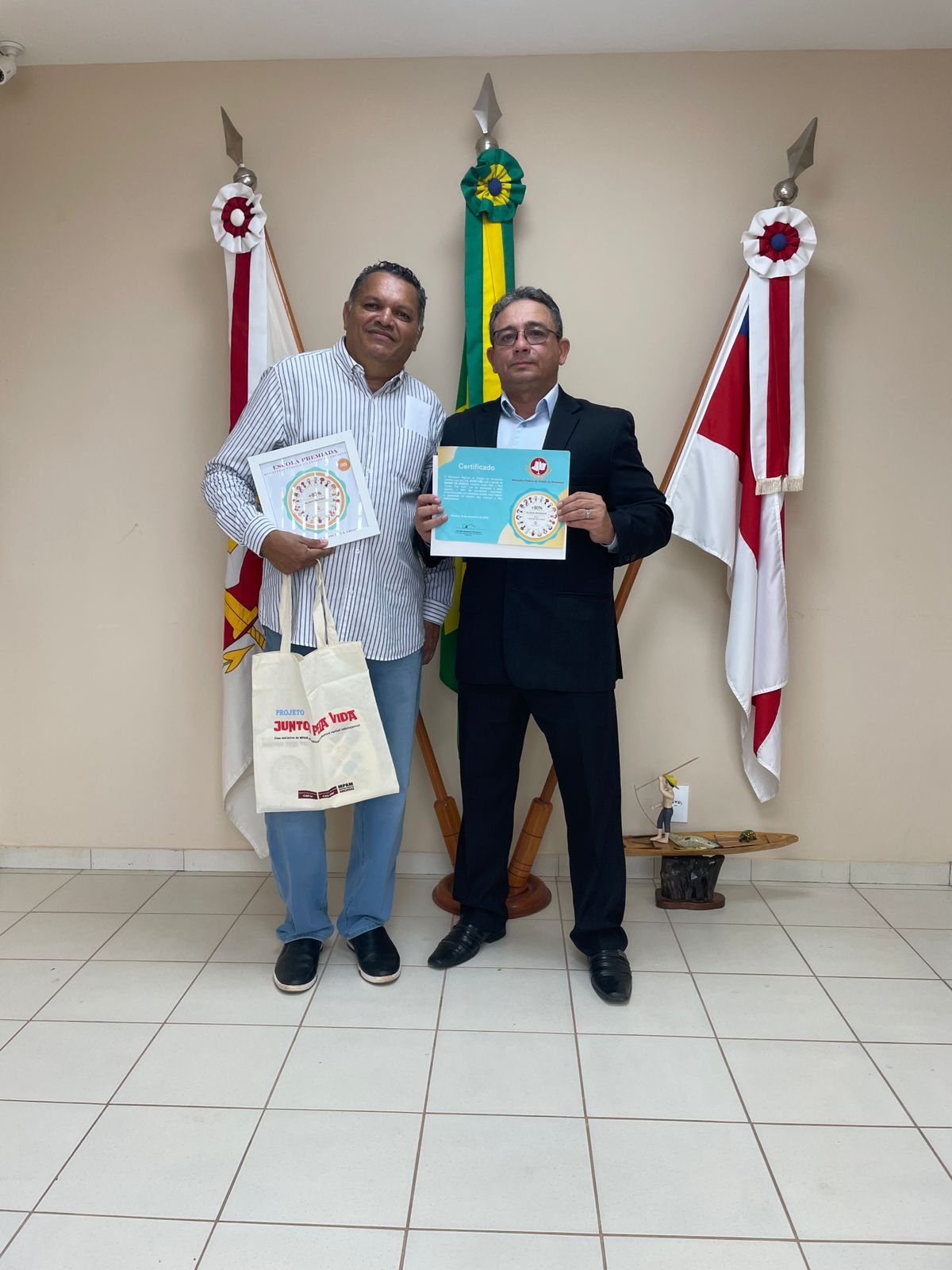 O Ministério Público do Estado do Amazonas (MPAM), por meio da Promotoria de Justiça de Autazes, realizou a entrega do selo do projeto “Juntos Pela Vida” à Escola Estadual Novo Céu, pelo alcance de 80,2% de cobertura vacinal. O selo reconhece e certifica as escolas do Amazonas que atingiram ou superaram a marca de mais de 80% de alunos vacinados.