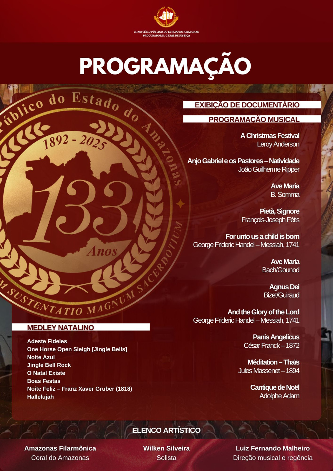 A apresentação reúne dois patrimônios culturais do estado: a Amazonas Filarmônica e o Coral do Amazonas, formações que, ao longo das últimas décadas, consolidaram-se como símbolos da força artística amazonense. Sob a direção musical e regência do maestro Luiz Fernando Malheiro, o concerto apresenta um repertório que atravessa séculos de tradição e conecta o público às sonoridades mais emblemáticas do Natal.