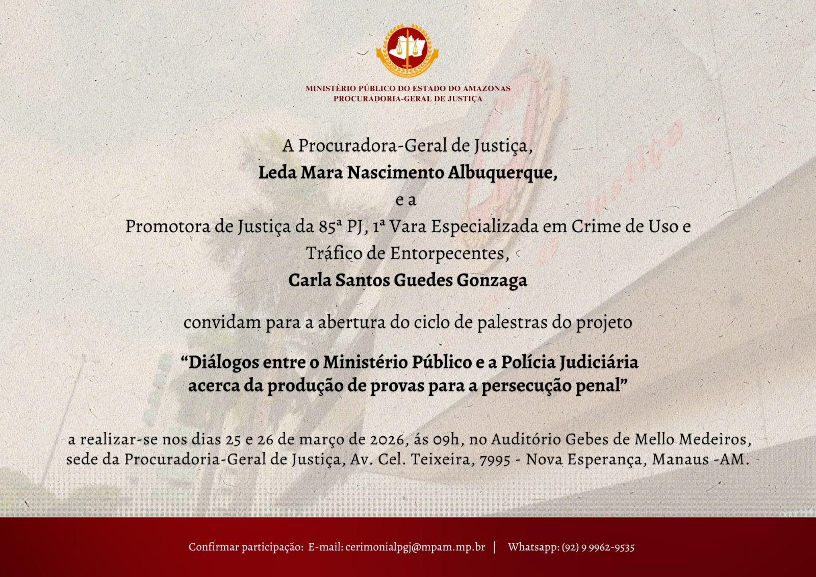 O Ministério Público do Estado do Amazonas (MPAM) realizará, nos dias 25 e 26 de março de 2026, a abertura do ciclo de palestras do projeto “Diálogos entre o Ministério Público e a Polícia Judiciária acerca da produção de provas para a persecução penal”. O evento ocorrerá no auditório Gebes de Mello Medeiros, na sede da Procuradoria-Geral de Justiça, em Manaus.