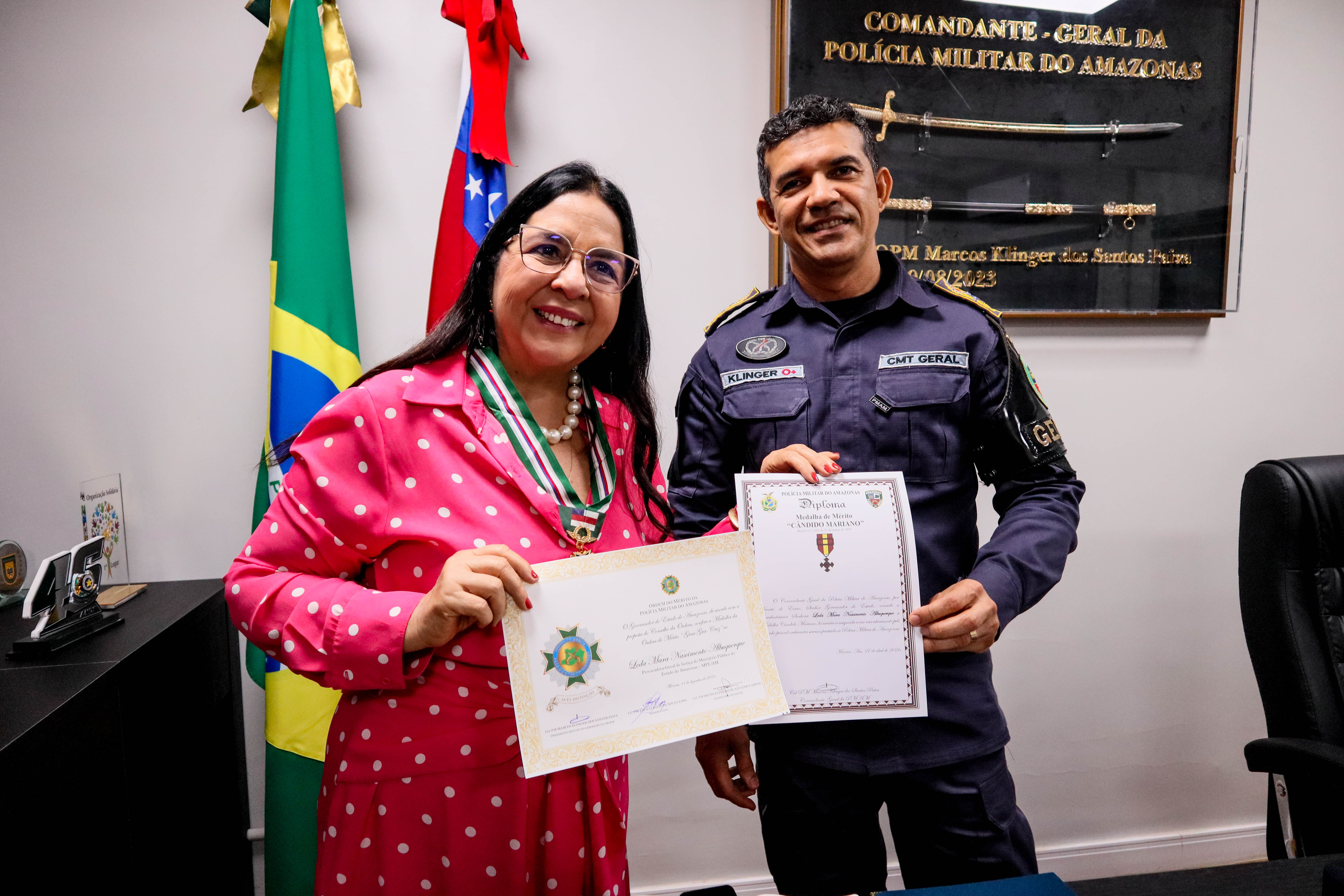 A chefe do MP amazonense recebeu as Medalhas Cândido Mariano e Ordem do Mérito, entregues pelo comandante-geral da PMAM, coronel Klinger Paiva. As honrarias reconhecem personalidades que se destacam pelo compromisso com a Justiça, a legalidade e a prestação de serviços relevantes à sociedade.