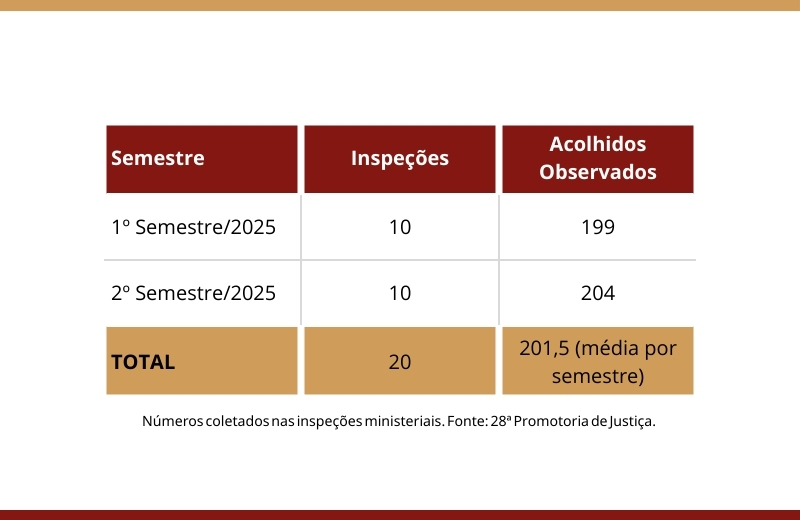 No último ano, as atividades fiscalizatórias in loco percorreram 10 casas de acolhimento para crianças e adolescentes, duas vezes cada — uma em cada semestre, totalizando 20 inspeções. A metodologia adotada consistiu no registro do número de acolhidos no momento da visita, análise de documentos, verificação das condições de infraestrutura do abrigo, recursos humanos e conformidade com as orientações técnicas vigentes.