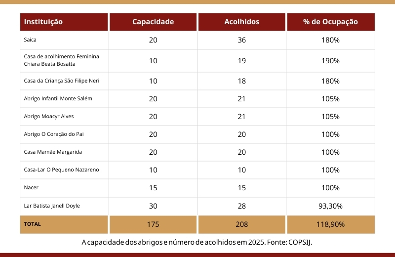 Conforme levantamento realizado pela Coordenadoria de Projetos Sociais do Juizado da Infância (Copsij), datado de 8 de outubro de 2025, durante a primeira fase das audiências concentradas — reuniões que reavaliam as condições familiares dos acolhidos —, todas as instituições de acolhimento de Manaus se encontravam operando acima ou no limite de sua capacidade máxima.